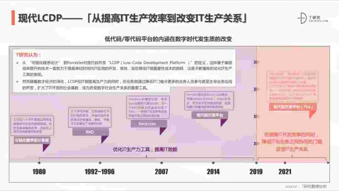 2020年前后,,,源于提高IT工作者开发效能的LCDP不断进化和衍生,,,面对业务导向日益明显的数字化变革。。LCDP衍生出了面向不同对象的升级服务——面向专业人群的LCDP和业务人群的NCDP,,LCDP与NCDP的不同服务属性被逐渐认可和接受。。。 LCDP在提高IT开发效率的同时,,,降低IT与业务之间协同的门槛改变IT生产关系。。。